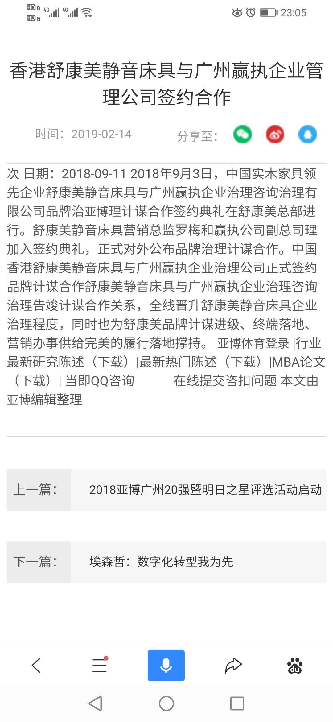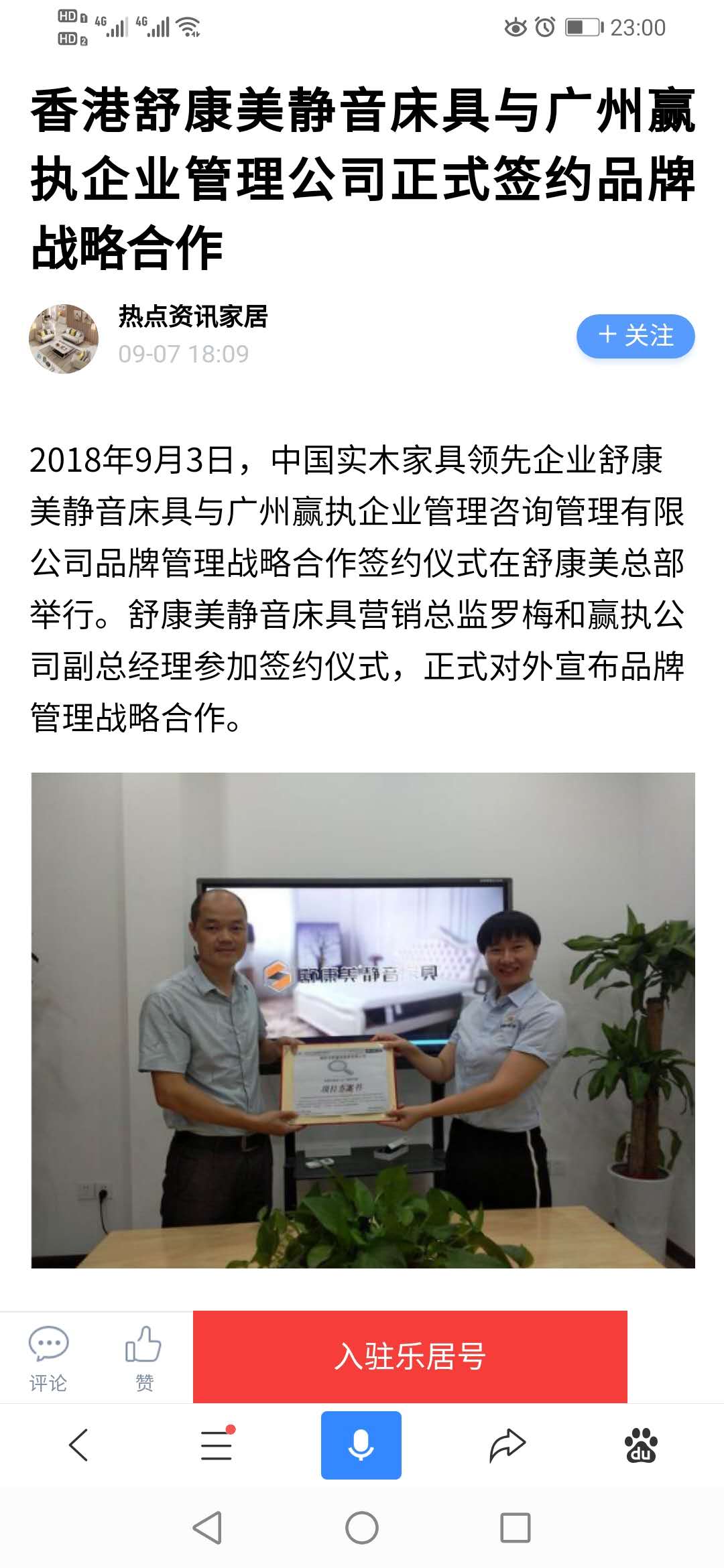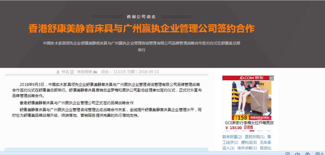 2018年9月3日,中國實木家具領先企業(yè)舒康美靜音床具與廣州贏執(zhí)企業(yè)管理咨詢管理有限公司品牌管理戰(zhàn)略合作簽約儀式在舒康美總部舉行。舒康美靜音床具營銷總監(jiān)羅梅和贏執(zhí)公司副總經理參加簽約儀式,正式對外宣布品牌管理戰(zhàn)略合作。